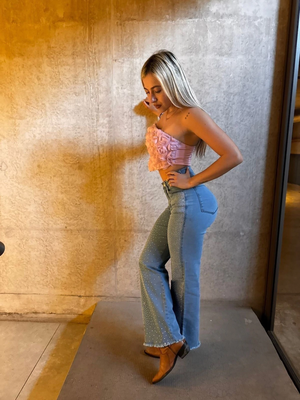 El top es un strapless en tono rosa pastel, confeccionado en una tela con volumen que forma delicadas flores en relieve tipo rosas en toda la superficie. Su diseño en forma de corazón realza el escote y le da un aire romántico y femenino. Ajustado al cuerpo, crea una silueta favorecedora ideal para looks de noche, salidas especiales o eventos donde quieras destacar con un toque sofisticado y original.